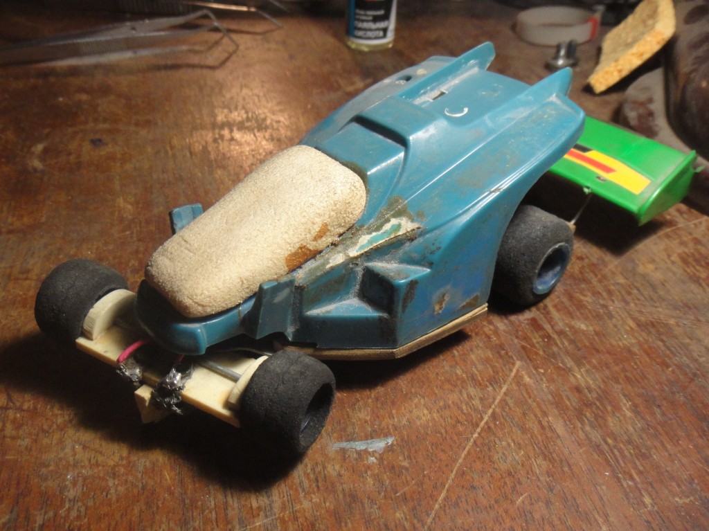 Ещё один стеклопластиковый эксперимент – Chaparral 2J – я сделал, потому что он весь состоит из простых плоскостей. Я склеил болванку из жёсткого пенопласта и оклеил ее стеклотканью. Потом плоскости поверхностей сделал на фрезерном станке (!) и выскоблил пенопласт изнутри получившейся стеклопластиковой скорлупы. Это, понятно, «одноразовая» технология, по такому же принципу я делал корпус для «Прибоя» в своё время, только там болванка была деревянная. Фанера для шасси Чапарраля была не обычная, а с углепластиковыми слоями, нашёлся кусочек такой как раз под модель. Впрочем, это не помогло ей ехать быстрее других экспериментов. Скорее на скорость этой модели повлияло то, что больше никаких «инноваций» в ней не было, поэтому она достигала скоростей, на которых в поворотах её уже начинало ощутимо носить. Главным плюсом в ней был мотор Piko, который практически не грелся и у которого не видно было, чтобы уходили щётки, они были графитовые, поэтому бороться с тем, как модель носит в виражах, можно было сколько душе угодно.