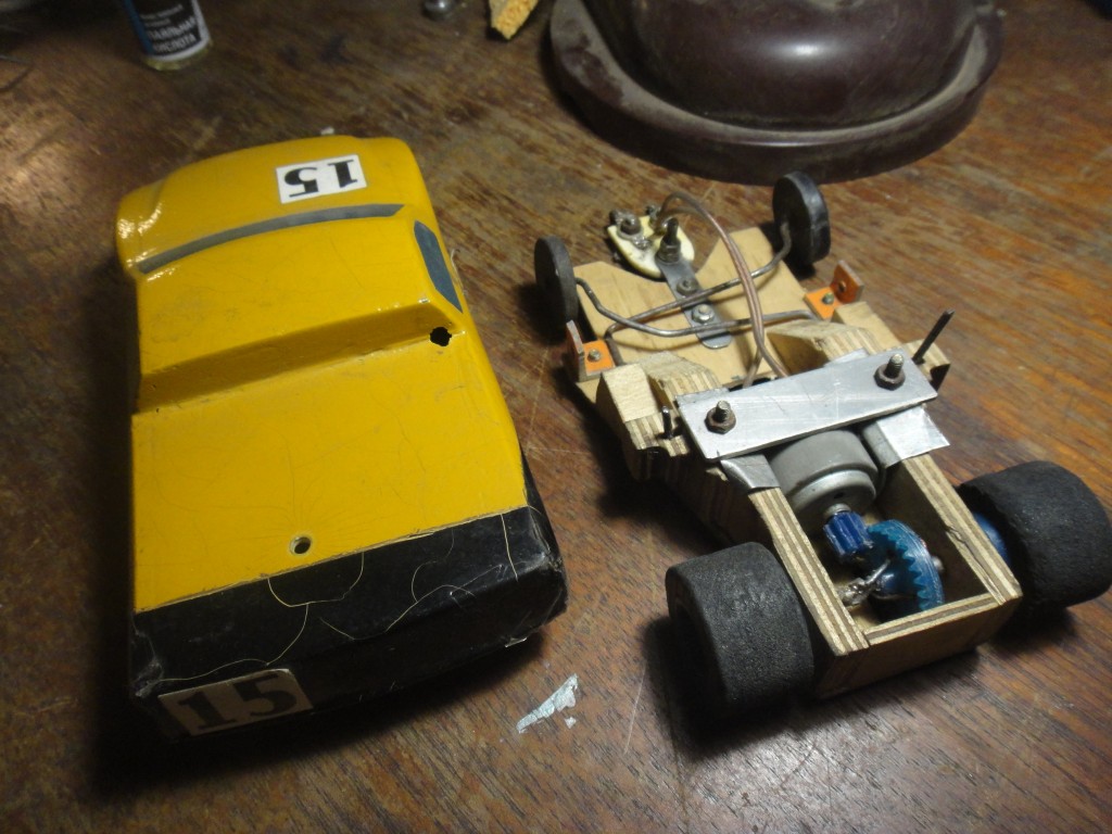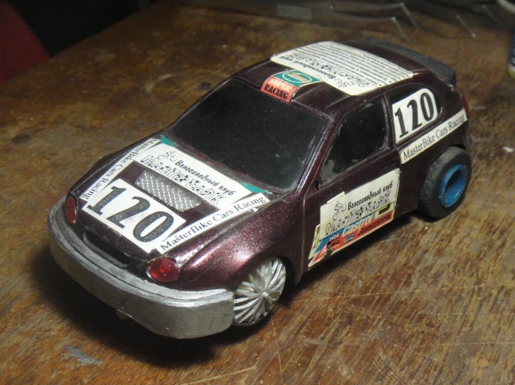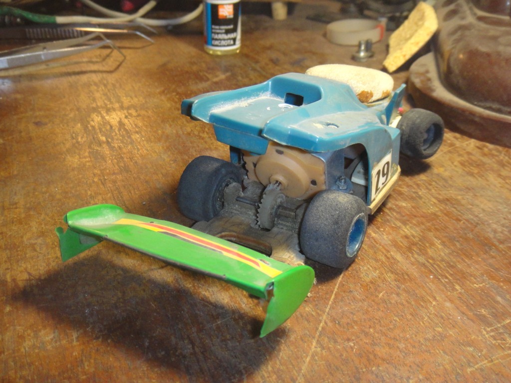 Потом была пара лет плотной дружбы, сотрудничества и несколько совместных соревнований. К нам Олег приезжал только один раз, потому что их трасса была объективно лучше, кабинет просторнее, а их модели совсем никак было не заставить ехать на нашей маленькой трассе, по тому самому виражу. Мы стали разрабатывать совместные общие правила, вместе расшифровывать всякие непонятные фразы из «красной книжечки» — как это «при наклоне модели передние колёса должны касаться трассы раньше шасси»? Колёса же и так уже стоят на трассе! При этом мы не стали пытаться соответствовать этим правилам, назвав все свои модели «G -7 модель свободной конструкции». Мы придумывали свои классы, исходя из тех наработок, что у нас уже были. Одним из таких удачных совместных классов был «Игрушка». Смысл в том, что игрушечная машинка подходящего размера и масштаба перепиливается в трассовую, причем можно и нужно даже с сохранением днища!
