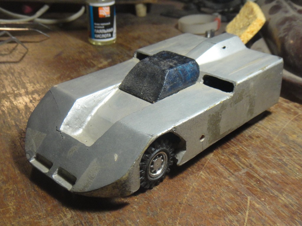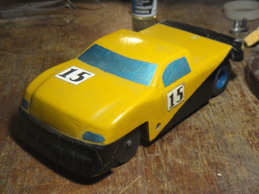 До этого кузовная технология у нас была только одна, пришедшая из кордовых моделей-копий – стеклопластик. Наверное, поэтому Дмитрий Алексеевич не замаскировал окна, ведь в стеклопластике их прорезают и вставляют прозрачный материал. Понимая, что кузовов становится всё меньше, следующий кузов я решил использовать… в качестве матрицы для выклейки стеклопластиковой копии! Получилось две копии, на второй лексановый кузов порвался совсем, несмотря на разделительный слой. Этот кузов пошёл на модель с экспериментальной подвеской передних колёс, которые я выточил из эбонита, ну был кусок подходящего диаметра. Я всё пытался совладать с нашим виражом на мост. Хотя самое правильное было бы просто вырезать кусок опор и мост занизить, потому что уже было ясно, что мы сделали его выше чем надо минимум в 2 раза. Но на трассу у нас уже ушёл год, и трогать её снова было просто страшно. Подвеска на хитрой формы рычагах из велосипедных спиц (а их шляпки удерживали колёса) работала, но прохождению виража не помогала никак. В этом стеклопластиковом кузове я окна не прорезал, а просто нарисовал их приготовленной из синего, белого и серебрянки голубой краской кисточкой на глазок по контуру.