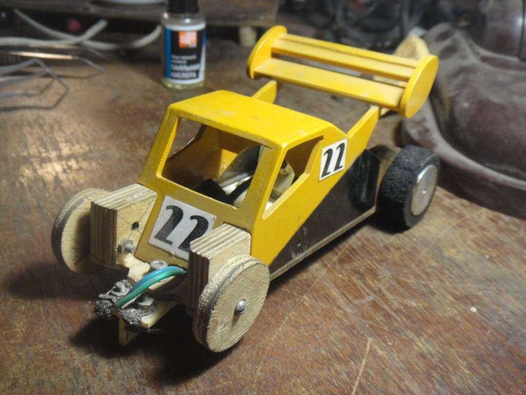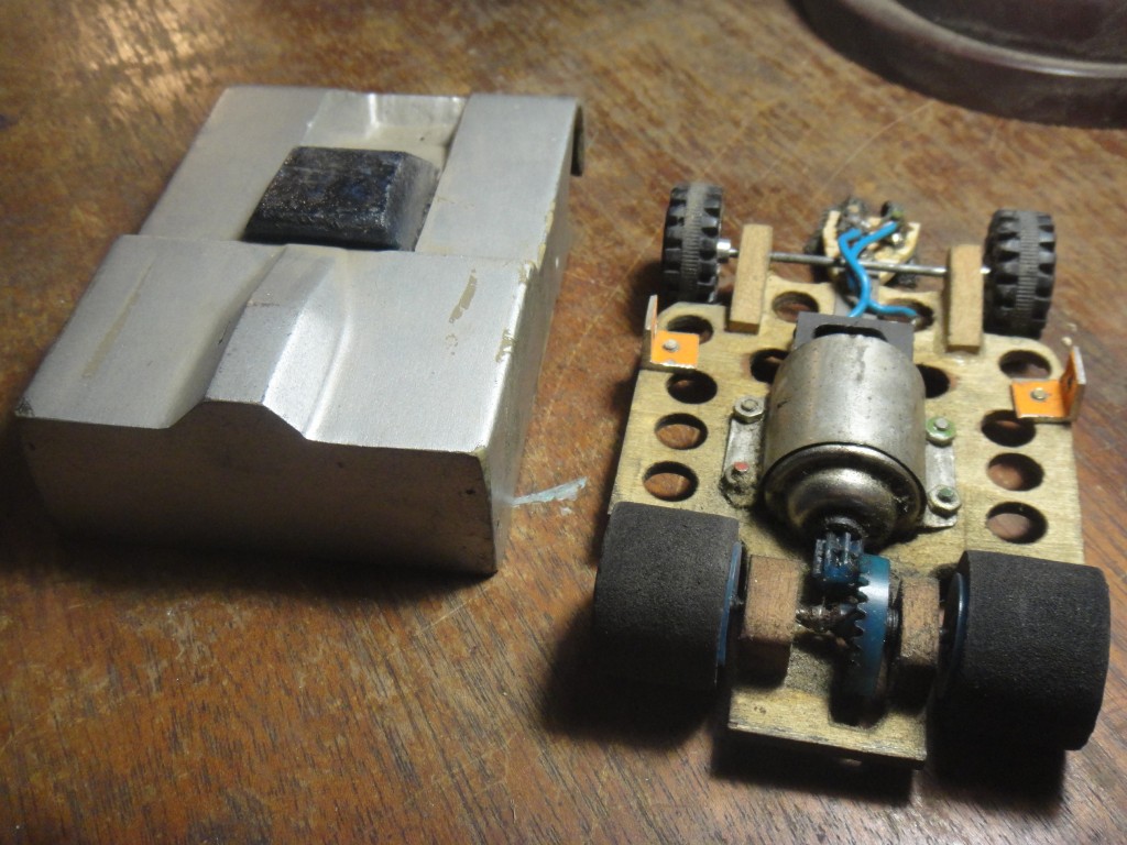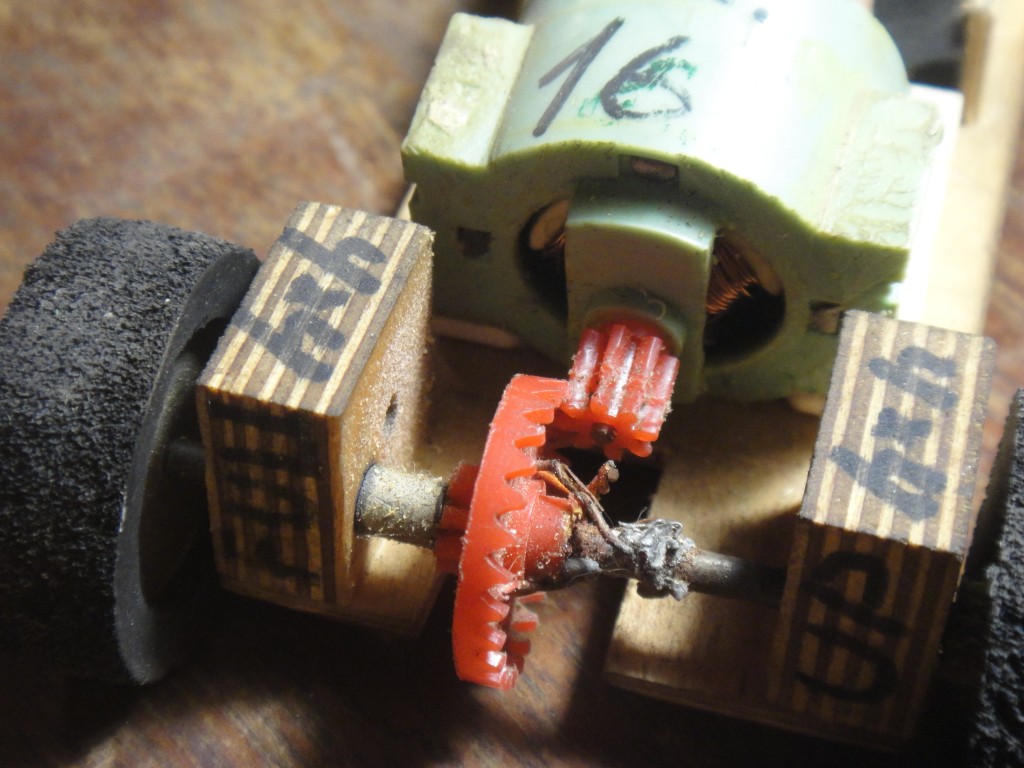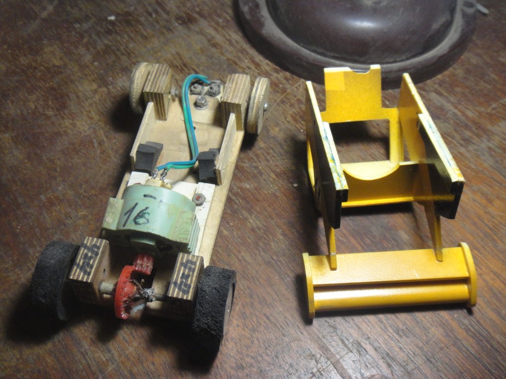 В итоге делали, что как бог на душу положит, и наиболее удачным вариантом стало использование кузовов от подходящих по размеру игрушек. Лишь я склеил из двухмиллиметрового полистирола практически полноценный кузов под конкретное шасси. Нарисовал произвольную фантазию, боковины подогнал, чтобы они плотно вставлялись между кубиками, а для подстраховки добавил пару болтиков с гайками по бокам, которые потом заменились на иголки и кусочки микропористой резины. Я взял брошенную детскую модель, привёл её в порядок и сделал все возможные ее модернизации, которые мы к тому времени придумали. Самый «навороченный» мотор из корпуса от МП-2-007 с пропиленными окнами, ротор от МП-3-015, оказавшийся самым надёжным, а щётки из полосок бериллиевой бронзы, на которую я набрёл случайно, роясь в бескрайных кружковых загашниках, потому что штатные щётки не выдерживали долго. Трёхмиллиметровая стальная задняя ось (вместо латунной) имела приспособление от проворота шестерёнки: в ней сверлились маленькие отверстия, на ось напаивалась медная проволока, которая продевалась потом в отверстия на шестерне и скручивалась. Поскольку всё делалось на собранной модели, важно было не греть ось сильно, чтобы не поплавить пластмассовую шестерню, иначе всё пропало.