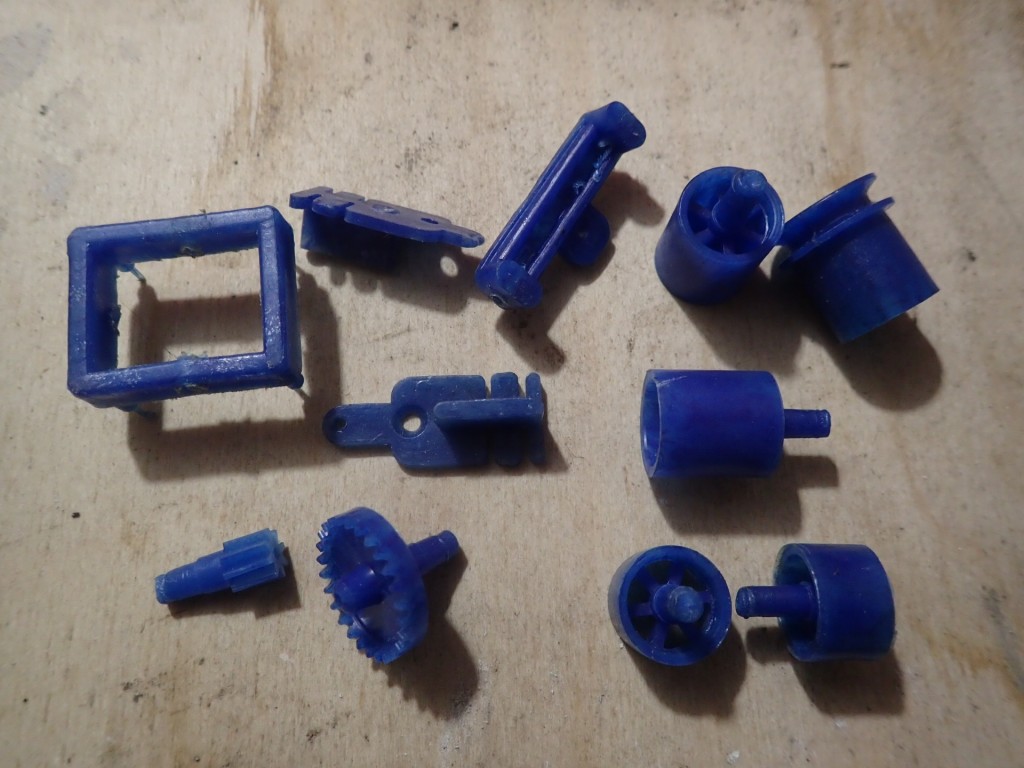 Моторы предполагалось использовать от игрушек – ДП-6, МП-2-007, МП-3-015 и т. д. Тогда ещё игрушки с этими моторами не были коллекционной ценностью, а были просто обломками, и надёргать с них моторов большого труда не составляло. Плюс где-то на какой-то фирме я нашёл эти моторы новые в продаже оптом, и купил сразу 2 коробки – всё, что у них было. Это были МП-2-007, у них были ужасные, очень слабые коллектора, зато разборные корпуса. Значительная часть того запаса, потому что все их мы потратить тогда так и не успели. Мотор приклеивался дихлорэтаном на подмоторную раму из полистирола – плоское основание из куска толщиной 2 мм с двумя полосами толщиной 4 мм, которые спиливались под требуемый угол наклона, всё так же склеивалось дихлорэтаном, потом эта конструкция привинчивалась к модели, и, двигая мотор вперёд-назад, можно было добиться соосности редуктора. Называлось это «модель класса «Карт»».
